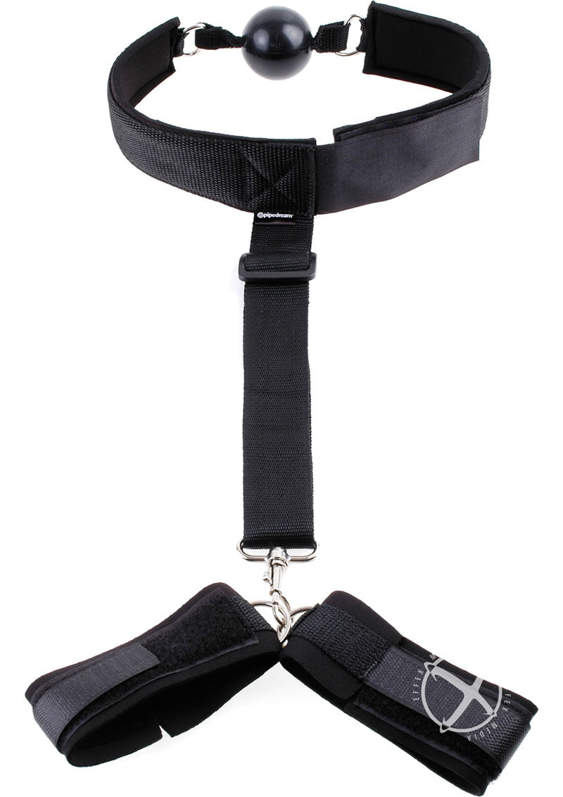 If you`re looking for the ultimate all-in-one beginner bondage essential, look no further! The Fetish Fantasy Gag and Wrist Restraint will keep your lover gagged, bound, blinded, and under total control. The comfortable gag head-strap easily adjusts and features a nylon neck-to-wrist restraint strap that connects to the cuffs in the back. With your subjects hands cuffed behind their back and their mouth open and gagged, you can explore unlimited fantasies without them ever saying a word or escaping.The neoprene cuffs each have metal D-rings that attach to a metal spring clip on the back strap, and the cuffs easily adjust with Velcro to fit most sizes. The back strap can also be adjusted to change the placement of the subjects wrists. The firm rubber ball gag is made from phthalate-free PVC and is 2.25 wide. It`s perfect for beginner BDSM play and tough enough for even the most experienced users!Includes:- Firm Rubber Ball Gag- Adjustable Neck/Wrist Restraint- Adjustable Neoprene Wrist Cuffs- Free Satin Love MaskAlso, Phthalates Free and made with nylon, rubber, metal, and PVC
