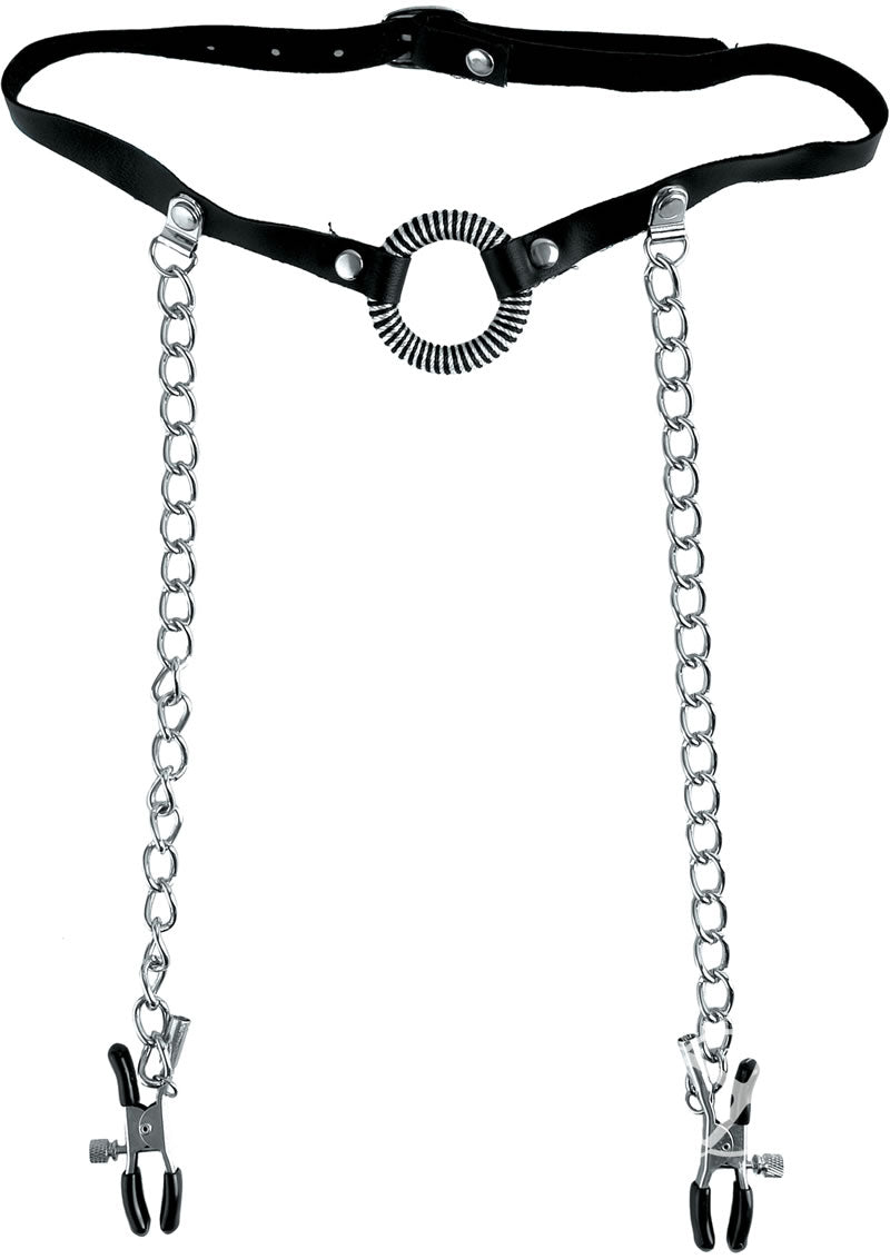 Fetish Fantasy Series Limited Edition. Get your lover to open wide and say ahhhh with this naughty O-Ring Gag with Nipple Clamps. The gag consists of a small metal O-ring wrapped in leather, connected to two sturdy leather straps. Two chained nipple clamps keep your nipples perky, and the coated clamps easily adjust to fit your desired tension. The leather straps adjust to fit most sizes, pulling the ring tight and keeping the mouth open wide. You`re in control over when and how often your lover speaks...what you do next is up to you!