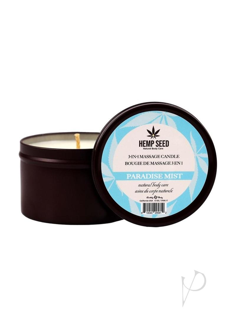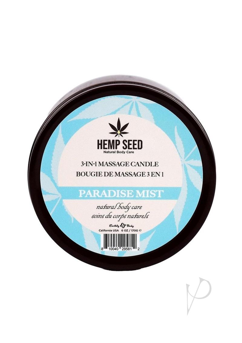 Hemp Seed 3-in-1 Massage Candle Paradise Mist -- with notes of sea salt, lotus petals and aged driftwood. VEGAN, THC-FREE; Specially formulated to melt a couple degrees above body temperature, our 3-in-1 massage candles don`t just provide romantic light and fragrance they melt into a decadent blend of six natural oils that can be used as a moisturizer or for a warm massage. Hemp seed oil, the primary ingredient in these candles, has a fantastic slip factor for massage and, because it absorbs to the lipid layer of the cells, skin is left soft and moisturized, not greasy or goopy.