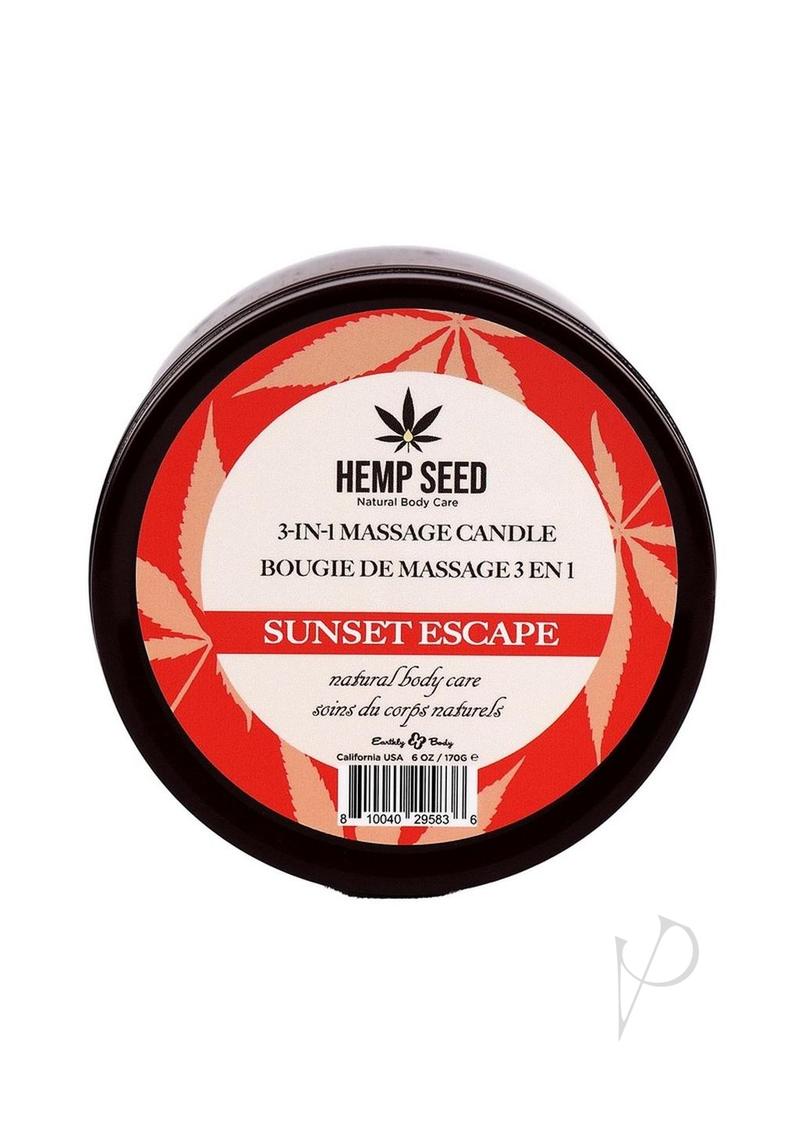 Hemp Seed 3-in-1 Massage Candle Sunset Escape -- delicately scented with sunflower petals, gardenia and soft musk.E2 VEGAN, THC-FREE; Specially formulated to melt a couple degrees above body temperature, our 3-in-1 massage candles don`t just provide romantic light and fragrance they melt into a decadent blend of six natural oils that can be used as a moisturizer or for a warm massage. Hemp seed oil, the primary ingredient in these candles, has a fantastic slip factor for massage and, because it absorbs to the lipid layer of the cells, skin is left soft and moisturized, not greasy or goopy.
