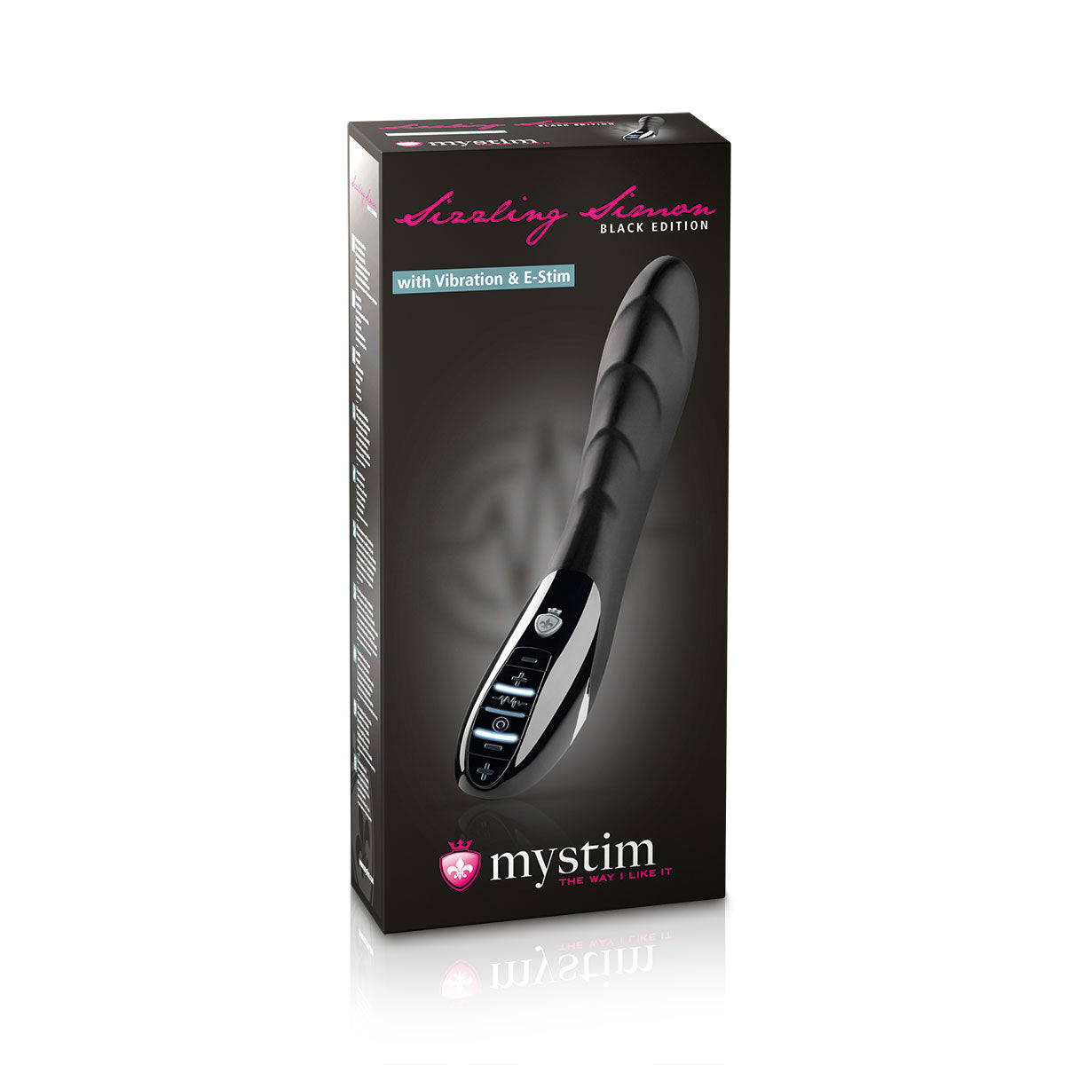 Sizzling Simon provides an unprecedented vibration and electrical stimulation at once! No cables or devices Sizzling Simon vibrates, tingles and pulsates all on his own. The E-stims have not one but two vibration motors: one in the tip and one in the shaft. These 2 motors work with 8 different programs and 5 different intensity levels to provoke ecstasy in a wide variety of ways. The E-Stim's conductive surfaces run the length of the toy's body to make the stimulation as smooth and broad as possible. Because 8 vibration modes and 5 e-stim varieties weren't enough, the Mystim E-Stims also have a training program that strengthens the muscles in the pelvic floor enhancing a woman's ability to reach orgasm. The three different functions are easily controlled via the buttons in the handle. Choose whether to use e-stim and vibration together or only one of them. The E-Stims are not only powerful but also extra quiet and made of 100% medical-grade platinum silicone, making them completely hygienic and easy to clean with a damp cloth and a mild soap. Underneath the silky soft surface hides a long-life, Lithium-ion battery that can be re-charged with the Mystim magnetic charge USB cable.