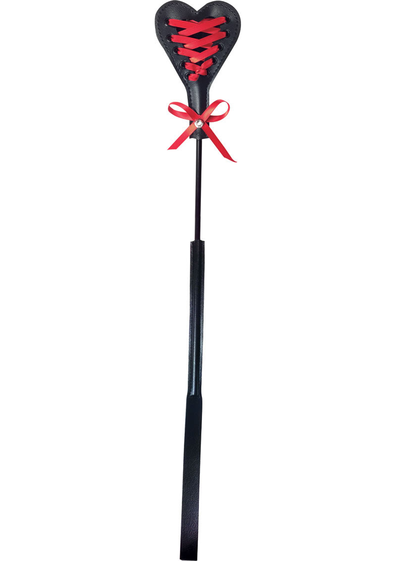 Create unique sensations with our new Heart Beat Crop. One side is smooth for spanking, stroking, and caressing. The other side features a plush red lace fabric tied up like a corsett harness and is adorned with a blinged bow. The bling adds to the sting! Use this beautiful new addition to your collection to invent your own Sex and Mischief fantasy.