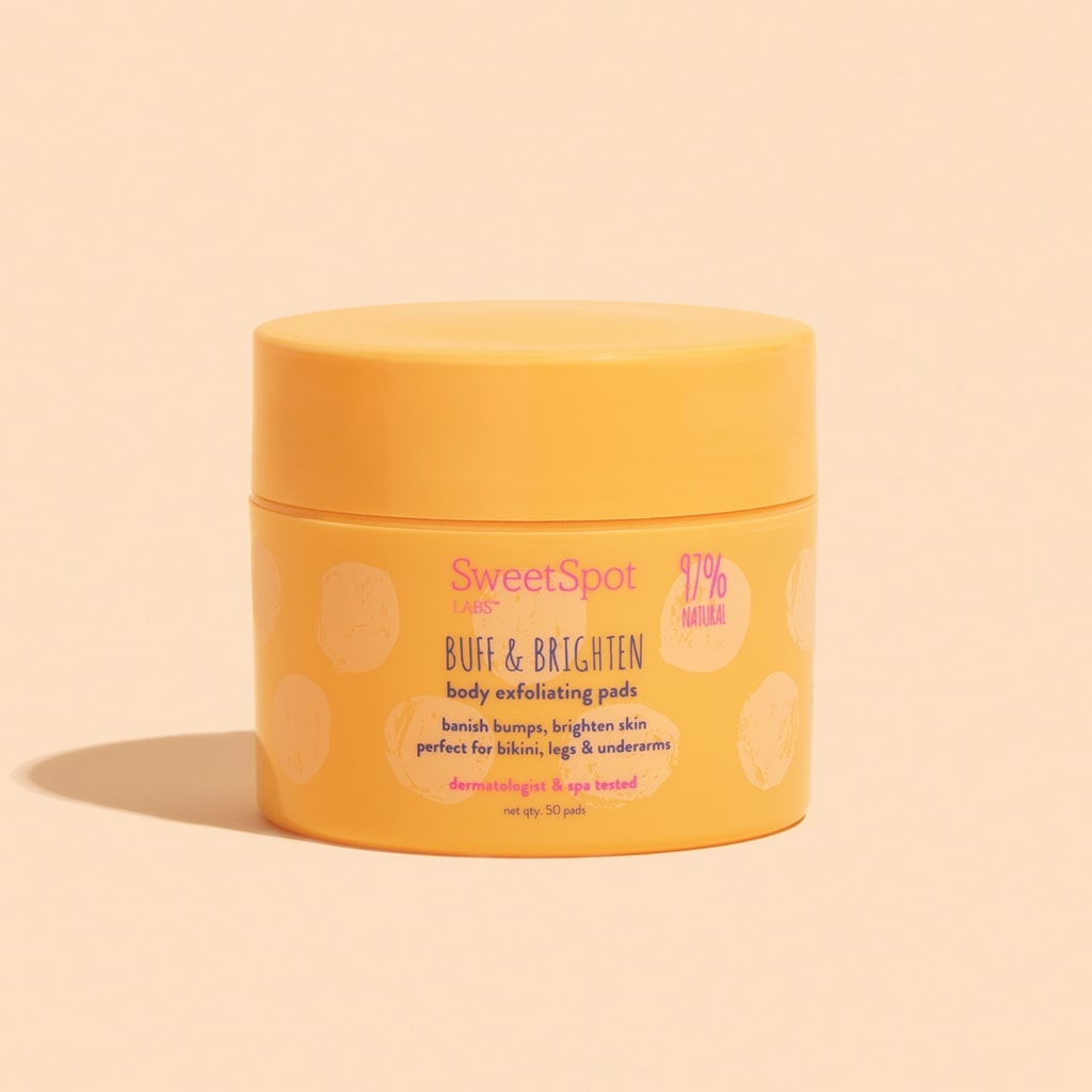 Buff & Brighten Body Exfoliating Pads provide both manual and chemical exfoliation to help put an end to the irritating side effects of hair removal. The oversized pH-balanced pads with glycolic acid (AHA) and willow bark extract (BHA), are a mess-free, one-step solution to buff away ingrown hair, razor bumps, and post-inflammatory hyperpigmentation. If used regularly, it can help prevent any of these from forming again. A soothing combination of witch hazel, aloe vera, and allantoin leave skin soft and smooth, not stripped and dry. Dermatologist-tested and recommended by spas, Buff & Brighten Pads are sweet on all skin, even the most intimate.