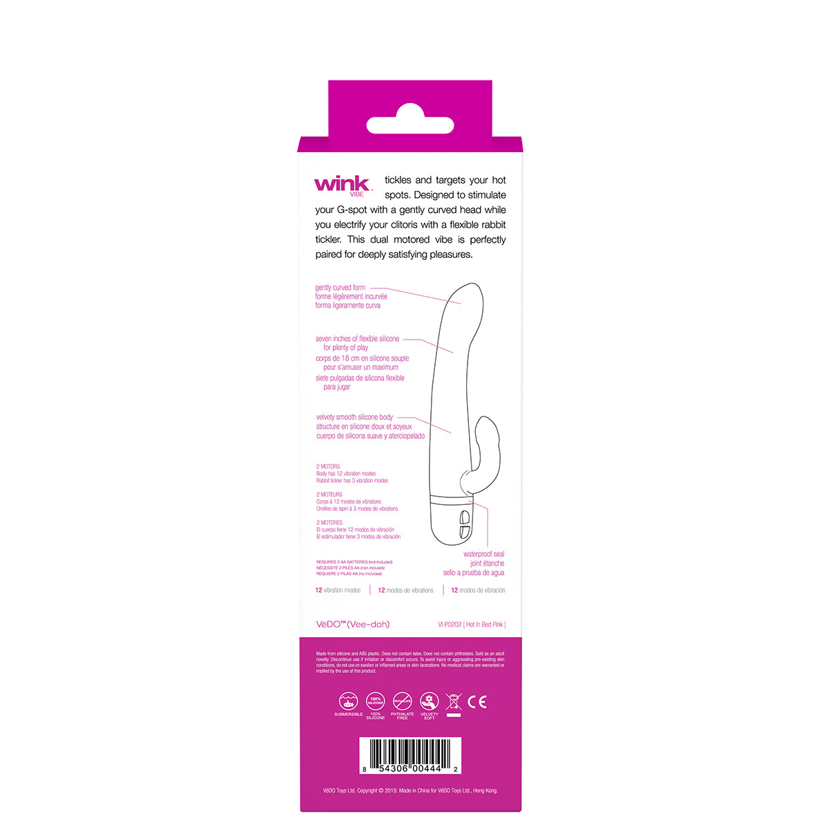 Wink teases and pleases every hot spot. Designed to indulge the G-Spot with a gently curved head while electrifying the clitoris with a flexible rabbit tickler. The 12 vibration modes in this vibe pack a powerful punch that's sure to please.